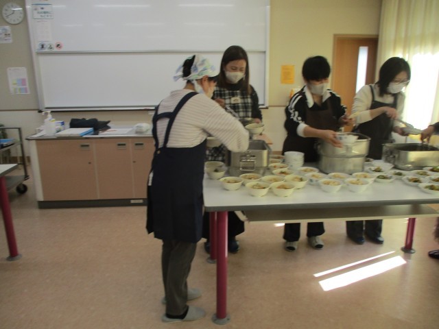 参加者の皆さんで配膳をしてから、各学級での給食準備の様子を参観していただきました。試食時間は、和気あいあいと和やかに食事を楽しみました。
