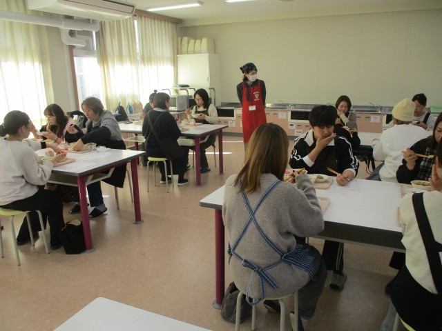 試食後は、戸島食育センターの栄養教諭の先生から、食育センターの調理のことや栄養のお話などを聞いて研修をしました。参加した皆さんからは、「栄養のバランスの取れた献立で、とてもいいと思います。」「給食のレシピを参考にして、家でも作ってみたいです。」という感想が聞かれました。