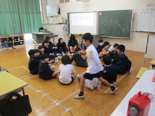 11月20日の昼休みに縦割り遊びがありました。縦割り班のメンバーで6年生が考えた遊びをします。「フルーツバスケット」や「天下」、「絵しりとり」などいろいろな遊びを楽しそうにしていました。前に出て説明をしたり、みんなに楽しんでもらおうとがんばったりする6年生の姿が頼もしいです。2学期のたてわり遊びはこれが最後で、次回は1月です。