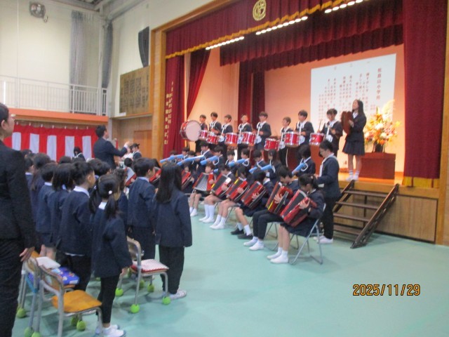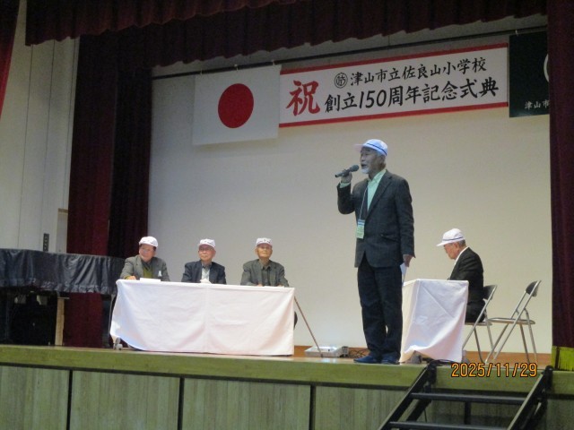 11月29日(土)に創立150周年記念式典を行いました。谷口津山市長様をはじめ、ご来賓、地域、保護者の皆様がたくさんお越しくださいました。晴天に恵まれ、皆様ともに佐良山小学校の150歳のお祝いをすることができました。「ふるさと」の歌に続いて、6年生の演奏に合わせて歌った校歌は、本当に素敵な歌声が会場に響き渡りました。