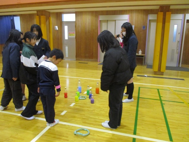 12月9日(火)に、5年生がつやま西幼稚園の年長児との交流をしました。4時間目に、体育館で5年生が準備した遊びを一緒にしました。ペアになった5年生が遊びのコーナーを一緒に回ってくれました。輪投げやボウリングやクレーンゲームなど楽しく遊べるように工夫をしていました。5年生は、幼稚園の子供たちが楽しめるように、企画や準備を協力して行いました。4月からは、1年生に優しくいろいろなことを教えるあげるすてきな6年生になってほしいです。