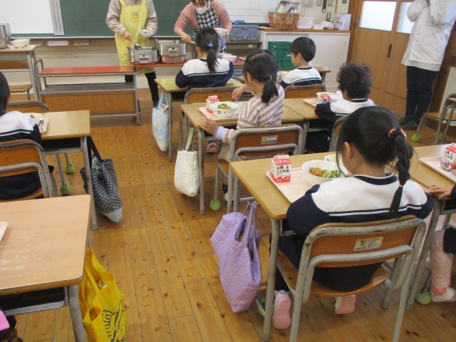 幼稚園の子どもたちは、5年生に優しくしてもらってうれしそうでした。その後、小学校の給食を食べました。メニューは、「つやま和牛入りビビンバ、牛乳、とんこつスープ」でした。「おいしかった。」「おなかがいっぱい。」と喜んでいました。小学校への入学を楽しみにしてくれているようでした。