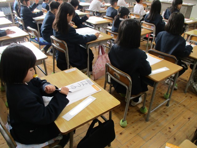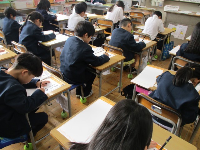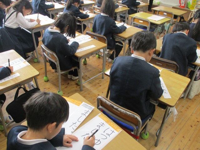 12月16日(火)は、1年生が書き初め展に向けて、フェルトペンを使って硬筆の練習をがんばりました。お手本をしっかりと見て、清書用紙に書きました。机の上のお手本や清書用紙の置き方まで全員が自分でしていました。