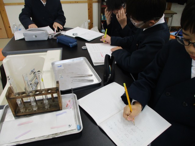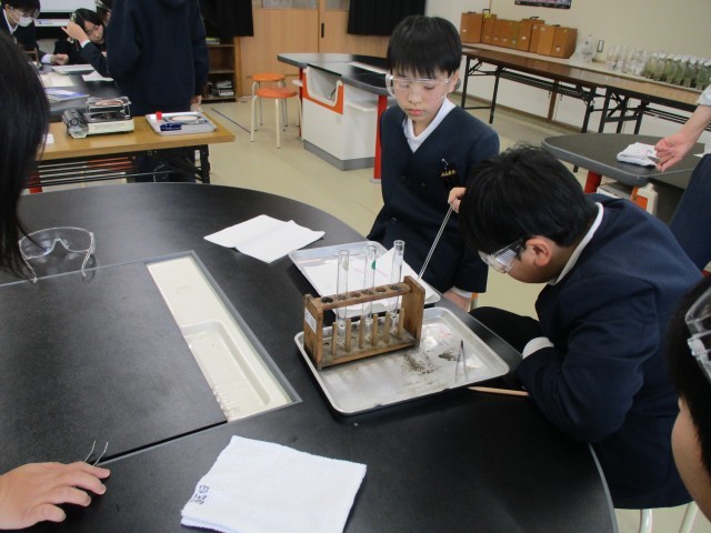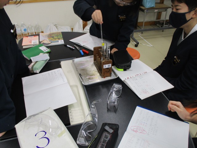 1月15日(木)、6年生では、理科「水溶液の性質を調べよう」の学習で、リトマス紙を使って水溶液を調べる実験をしました。食塩水、石灰水、炭酸水について調べました。各班で、協力して実験しました。実験道具を正しく使って、安全に学習することもできていました。色の変化によって、水溶液の性質をなかま分けすることを学習しています。「色が変わった!」と、すぐにノートにメモをする姿が見られました。興味をもって学習できています。身の回りにあるいろいろな水溶液の性質を調べてみたくなった人もいました。