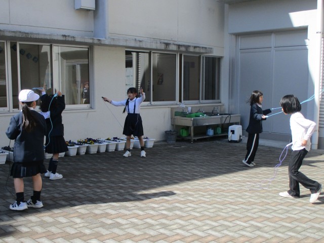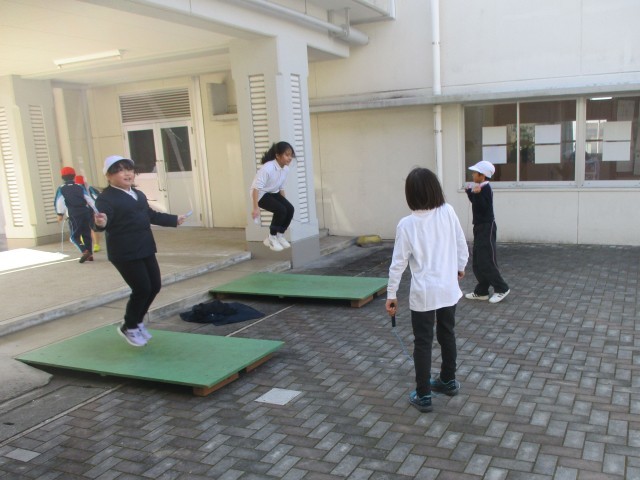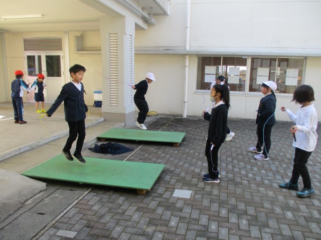 なわとびにチャレンジする子どもたちがたくさんいます。運動場ではなく、中庭のレンガ広場で、練習をしています。かけ足跳びやあや跳び、二重跳びやはやぶさ跳びなど、何度かかってもまたチャレンジする姿が素敵です。ジャンピングボードを使って順番に練習する姿も見られます。「連続でできるようになった。」「最高記録が出たよ。」と、自分の目標を決めて取り組むことができています。