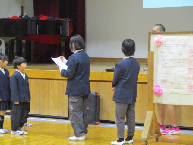 運営委員会からあいさつチャレンジの取組で、素晴らしかった人とクラスの表彰がありました。1年生が一番たくさんカードを集めていました。また、図書委員会からは、1年間の貸し出し冊数が100冊以上の人の表彰がありました。最高冊数は、242冊でした。100冊以上の人が17人いました。表彰状と図書委員が作成した記念バッジが贈られました。