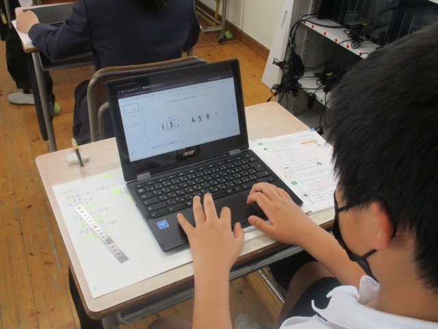 このような問題から、徐々に小数点が加っても並び替え問題を解くことができるという流れでした。タブレットを使って並び替える子や、ノートに答えとその理由も書き込む子もいました。集中してがんばる姿が多く見られました。今後は、なぜそう考えたのかを説明することを大切にしてほしいと思います。