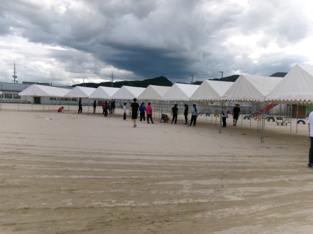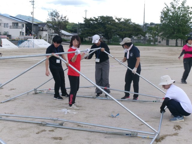 一人では持ち上がらないような重い骨組みも、みんなで力を合わせればこの通り!あっという間にたくさんのテントが完成しました。