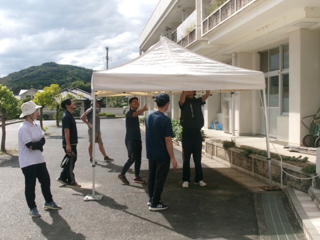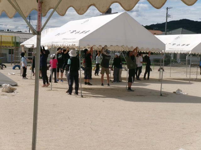 9月27日に迫った運動会!今日は、先生たちみんなで力を合わせて、グラウンドにテントを立てました。