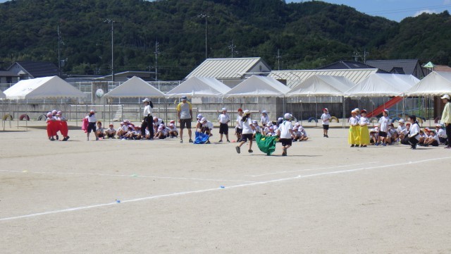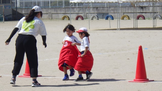 2人でひとつの大きなパンツに足を通し、「いち、に、いち、に」と声をかけ合いながら、息を合わせて走っていました。周りの人は友だちに「頑張れ!」と大きな声援を送っていました。