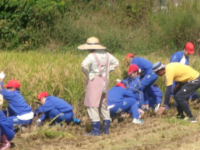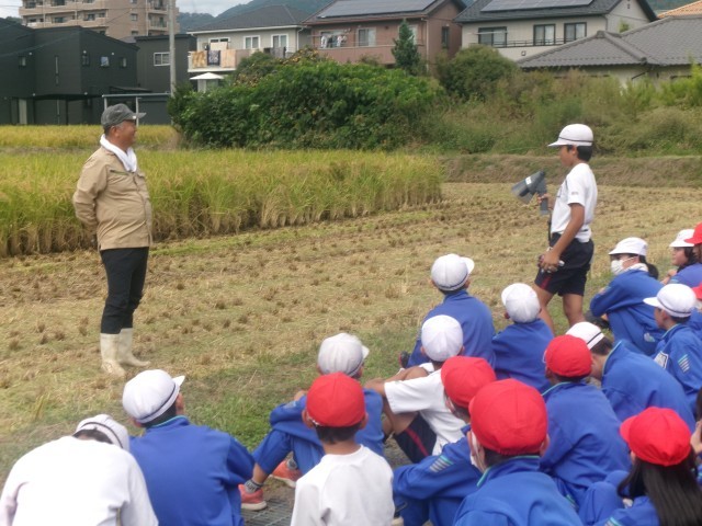 秋晴れの下、田んぼに向かった子どもたちは、体操服に身を包み、帽子をかぶって気合十分。5年生が稲刈りに挑戦しました。稲刈り作業は、昔ながらの手刈りと、機械(コンバイン)を使った収穫の様子を見学しました。地域ボランティアの方々に教えてもらいながら、鎌を使って丁寧に稲を刈り取りました。株元をしっかり持ち、刈り終えたらすぐに稲を抱え、まとめる作業に移行します。稲束の重みを両腕に感じ、「これが私たちが育てたお米なんだ」と、達成感を得ていました。地域の方が大きなコンバインを操作し、一気に稲が刈り取られ、脱穀されていく様子は圧巻でした。子どもたちは、現代農業の効率性と技術の高さを目の当たりにし、食を支える工夫についても学びを深めました。稲刈りを通して、子どもたちは食卓に並ぶお米が、種まきから収穫まで、いかに多くの手間と時間、そして地域の皆様の知恵と努力によって育まれているかを身をもって体験しました。この経験は、単なる農業体験ではなく、「持続可能な社会の実現」や「食料生産の現状」といった高学年で学ぶテーマを考える上での大切な土台となります。地域ボランティアの皆様、ご指導と温かいご支援をいただき、誠にありがとうございました。