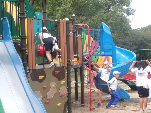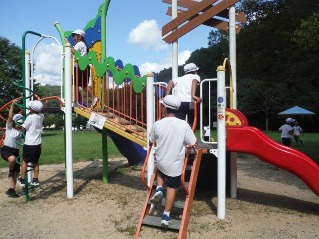 午後からは、瀬戸総合運動公園で体を動かしました。工場見学で頭を使った分、思い切り遊んでリフレッシュです。友達と協力しながら、大きな複合遊具やローラーすべり台に挑戦! 順番を守って遊んだり、難しいところでは手を差し伸べたりと、助け合う姿が見られました。秋の心地よい風を感じながら、芝生の上でお弁当を広げました。友達とのおしゃべりを楽しむ、素敵なピクニックタイムとなりました。