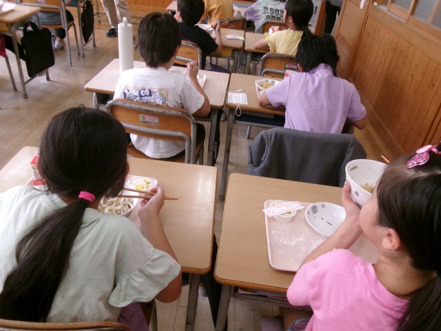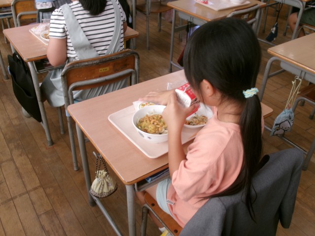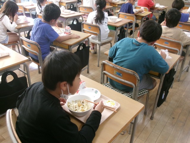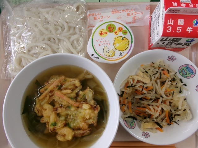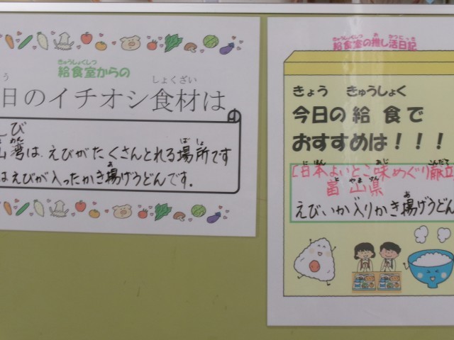 今日の給食は日本よいとこ味めぐり献立「富山県編」でした。メニューはえびいか入りかき揚げうどん、おわすい、梨ゼリー、牛乳でした。富山湾で獲れる「白エビ」。今回は白エビではありませんが、えびが入ったかき揚げでした。「おわすい」は「お酢和え」がなまって呼ばれるようになったそうです。甘酢のあえもので特別な日に食べる料理です。富山県は明治時代から梨を栽培しており、県を代表する果物のひとつとなっています。委員会の放送でも富山県のことが紹介され、子どもたちは富山県のことを思いながら食べたのではないでしょうか。次回はどの県でしょう。楽しみです。