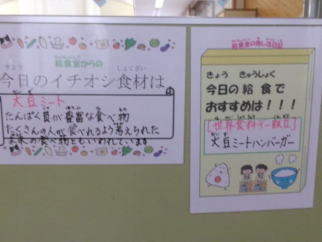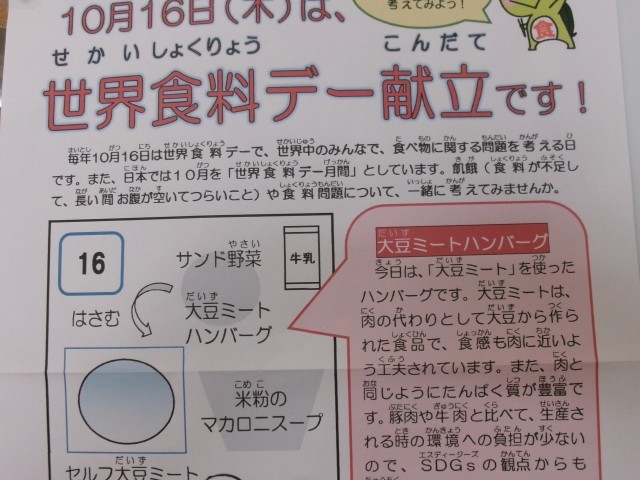 世界中で飢餓や貧困、そして食料廃棄など、食料に関する問題について考え、解決に向けて行動を起こすための国際デーです。今日の給食も、この「世界食料デー」の趣旨に合わせた特別な献立でした!今日の献立のイチオシ食材は「大豆ミート」!豚肉や牛肉に比べて、生産されるときの環境への負担が少ない環境に配慮した食材を使った「世界食料デー献立・大豆ミートハンバーガー」です!