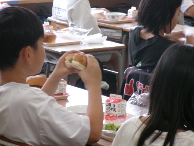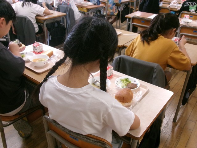 給食の時間には、大豆ミートハンバーグをパンに挟んで、みんな美味しそうに食べていました。世界では十分な食料があるにも関わらず、飢餓に苦しむ人々がいます。この「世界食料デー」を機に、私たち一人ひとりが「食べ物の大切さ」や「世界の食料問題」について考え、残さず食べることや食品ロスを減らすことなど、身近なところからできる行動を意識していきたいですね。