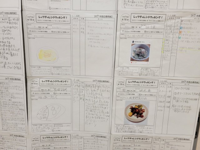 会場には、子どもたちの創意工夫があふれるオリジナルレシピと、美味しそうな料理の写真や楽しいイラストがずらりと掲示されました。どの作品からも、料理への探究心と、家族への感謝の気持ち、そして食への強い関心が伝わってきました。ある児童は、苦手な野菜を克服するために考えたレシピを、また別の児童は、地域に伝わる大切な行事食を紹介するなど、個性豊かな作品ばかりでした。来場された保護者や地域の方々も、一つひとつのレシピを熱心に読み、子どもたちの発想の豊かさに感心されていました。このレッツチャレンジクッキングへの参加を通じて、子どもたちが「食」の大切さや、「作ること」の楽しさを改めて感じ、今後の食生活に生かしてくれることを願っています。