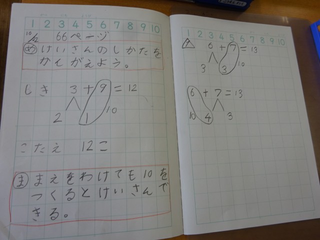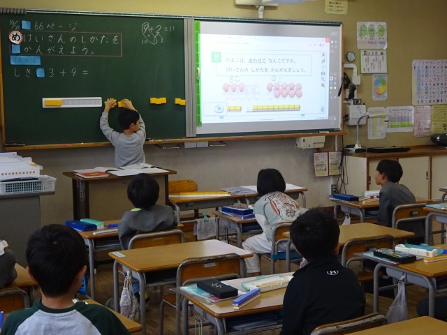 黒板の前で自分の考えを説明したり、先生と一緒に「たして10」の考え方を確かめ合ったりと、活発な学び合いが行われました。