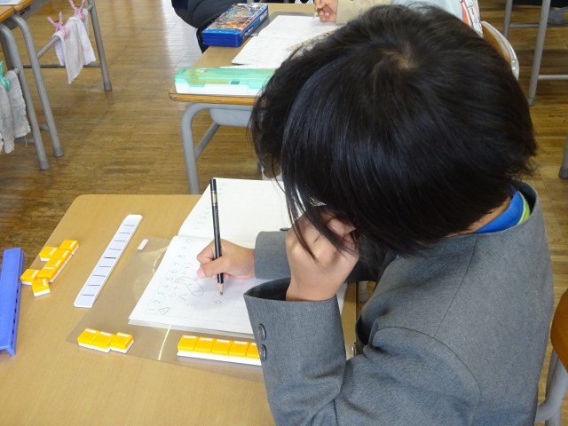 先生の「計算のしかたをかんがえよう」という問いかけに対し、子どもたちはブロックを使って、答えを探しました。「どうやったら10のまとまりが作れるか」と手を動かして考える姿が素晴らしかったです。