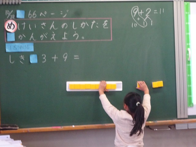 10月22日、1年生が算数の公開授業に臨みました。今日のテーマは「くり上がりのあるたしざん」(9+2や3+9などの計算)です。