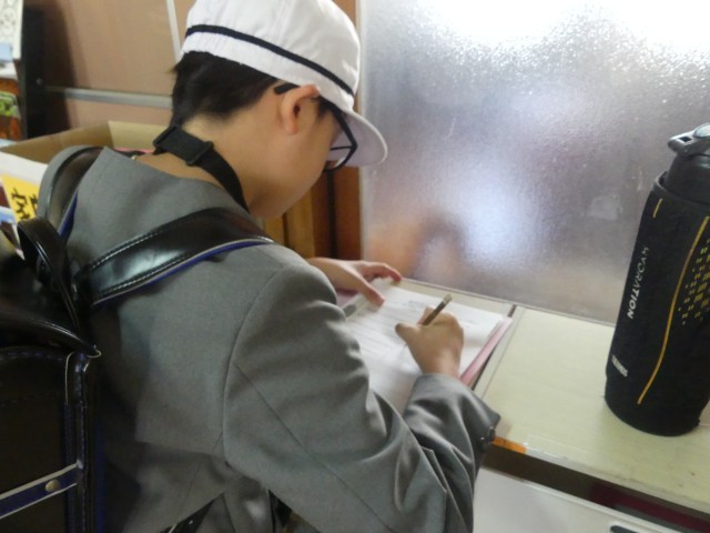 今朝も通学班で登校した班長たちは、班長が登校の状況を記録用紙に記入しています。高学年の児童が班長を務め、落ち着いた様子でチェックリストに記入する姿は、リーダーとしての責任感を示していました。記入後、班長は通学班担当の先生のところへ報告に行きます。「班のみんなで協力して、安全な登校」を班員全員が安全登校への意識を共有する機会となっています。