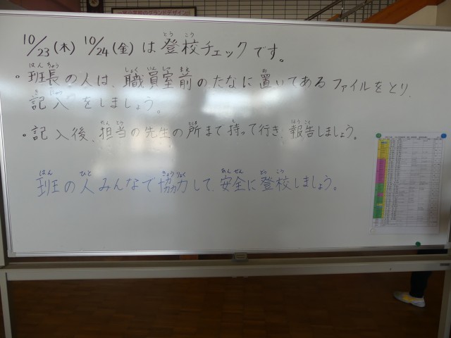 10月23日、24日は登校チェックが実施されます。本校では、日頃より通学班での安全な登校を心がけていますが、この「登校チェック」は、通学班が安全に登校できているか、児童自身が再度確認し、班長を中心に班員全員が協力して安全意識を高めることを目的としています。