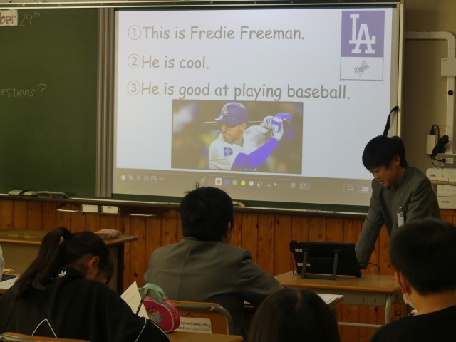 この活動では、子どもたちがタブレットを使って発表用のスライドを自分で作成し、クラスの友達に向けて英語で紹介しました。「This is Freddie Freeman. He is cool!」
