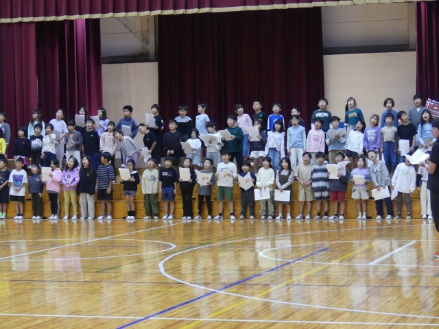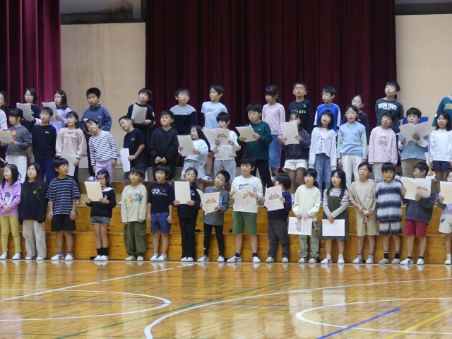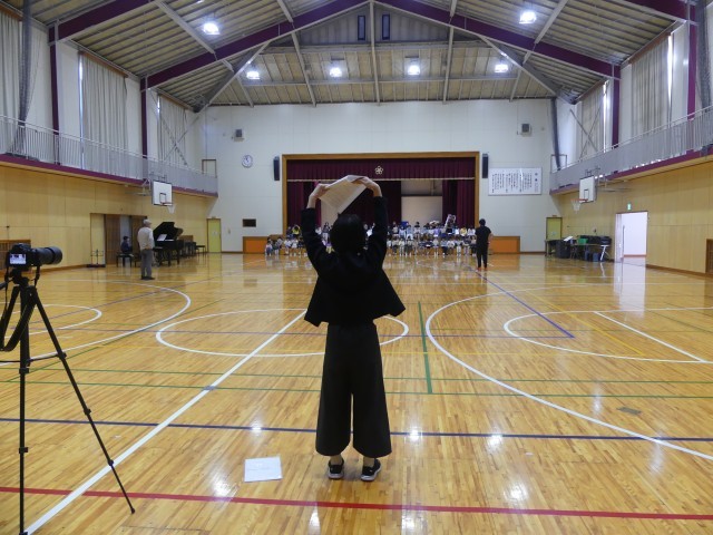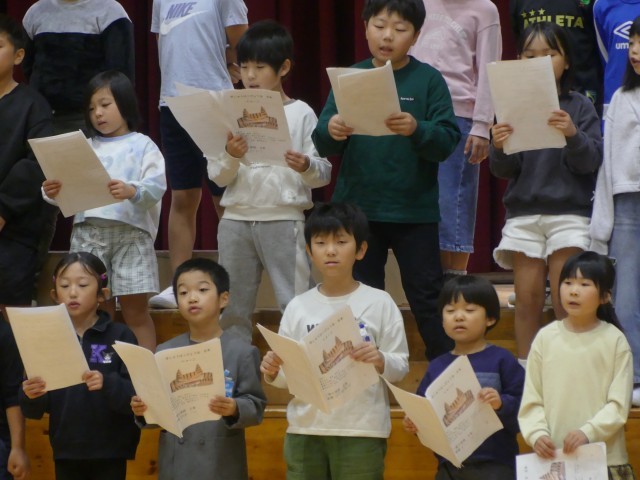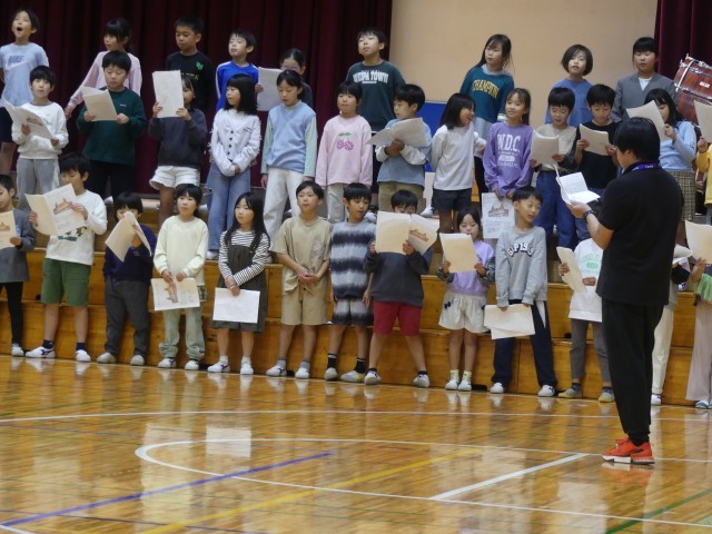 先生の指示に真剣に耳を傾け、立ち位置や動き、歌い方を一つひとつ確認しながら練習を進めています。友達と声を合わせる楽しさを感じながら、集中して取り組む姿が見られました。体育館いっぱいに響き渡る大きな声も素晴らしかったです。