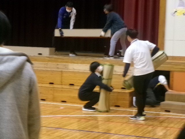 校内発表会での子どもたちの素晴らしい頑張りを受け、いよいよ本番に向けての準備が本格化しました。校内発表会の振り返りを行った後、教職員が一丸となり、体育館の会場設営作業を行いました。