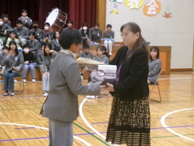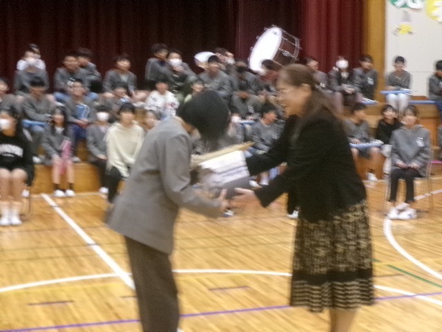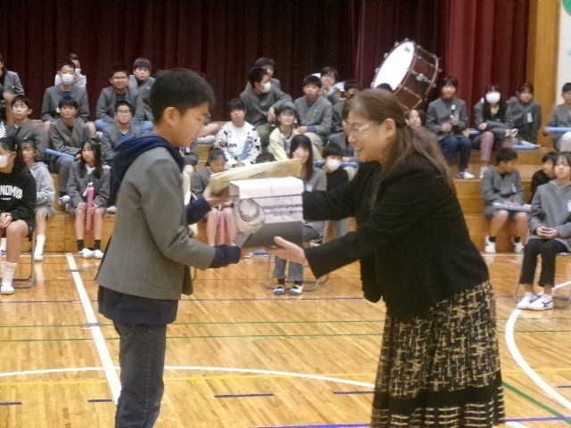 税に関する絵はがきコンクールに応募した6年生に津山法人会の方が来てくださり、参加賞を贈呈していただきました。贈呈式は、体育館に集まった6年生が見守る中で行われました。それぞれのクラスにサッカーボールと一人一人に参加賞をいただきました。絵はがきを描くために、私たちは税金が学校や病院、警察や消防など、みんなの暮らしを支える大切なことに使われていることをあらためて学びました。今回のコンクールを通して、税金は「自分たちの未来を守るために、必要なものなんだ!」ということがよく分かりました。これからも、税金の大切さを忘れずに、勉強や活動に取り組んでいきたいです!