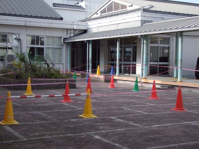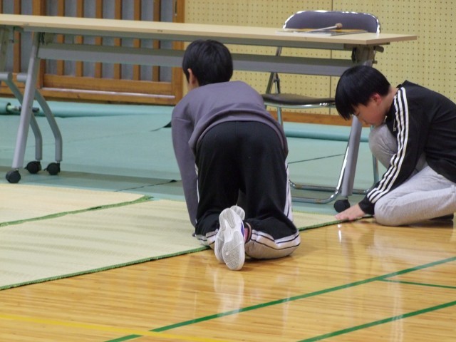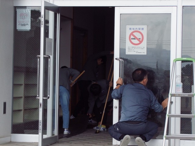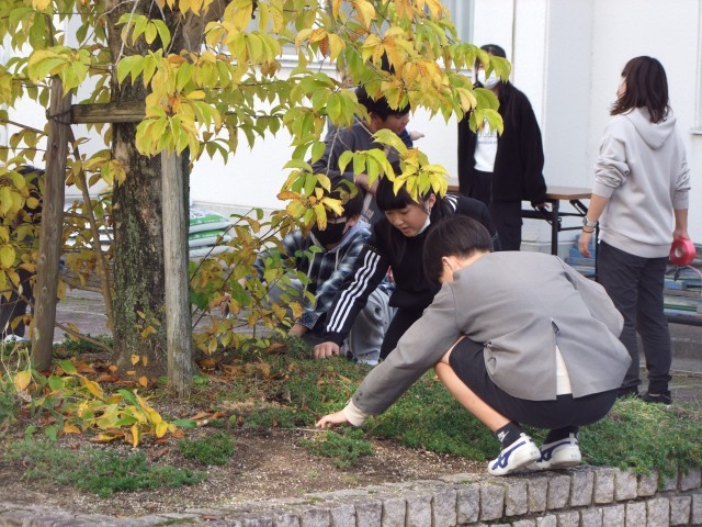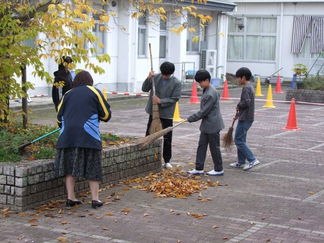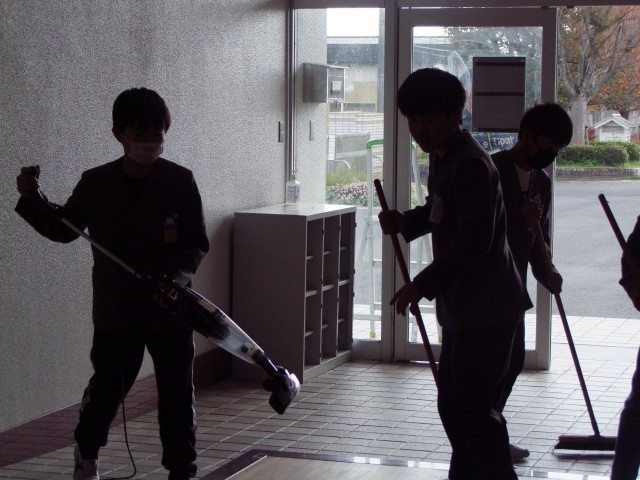 体育館の準備と並行して、校舎の出入り口付近など発表会当日に来場者をお迎えする場所の清掃も念入りに行いました。廊下や玄関では、箒や掃除機を使って床をきれいにしてくれました。校舎の外では、先生と一緒に落ち葉掃きに励む姿がありました。来場者への感謝の気持ちを表しているようです。