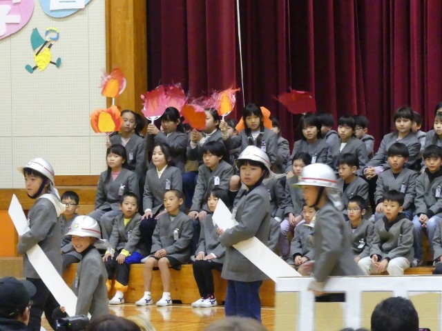 火事の起こりやすい時期やはしご車の梯子の長さなど難しい内容も工夫して伝えようと努力している姿は、まさに立派な3年生でした。「私たちの安全は、地域の方々消防署の方々によって守られていること」や「安全を守るために自分たちにできること」という大切なメッセージを、しっかりと観客に届けることができました。