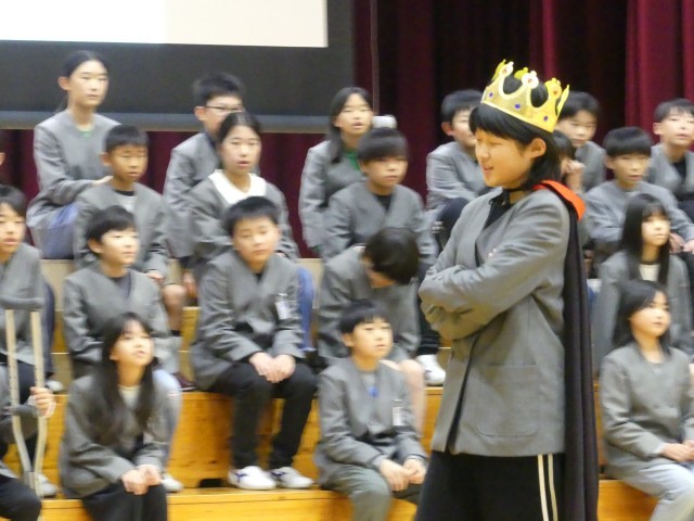 5年生は、国語で学習した物語をオリジナルの音楽劇「世界でいちばんやかましい音」として発表しました。セリフ、歌、動き、そして背景の映像を効果的に使い、物語の世界観をダイナミックに表現しました。この物語は、音のない静かな町を求めて旅に出た王様が、さまざまな音に出会い、最終的に「世界でいちばんやかましい音」とは何かを知るお話です。