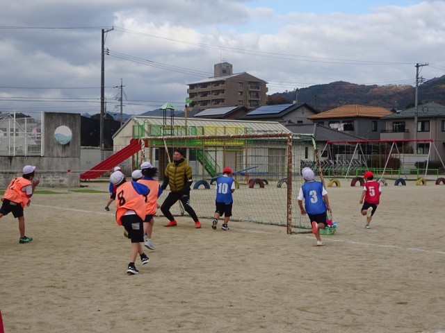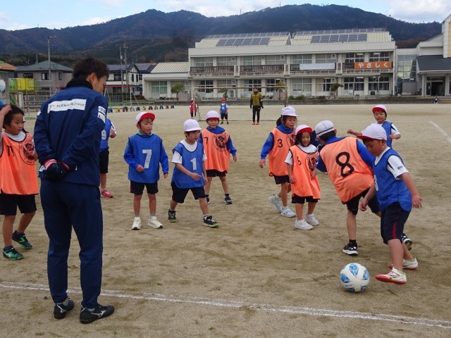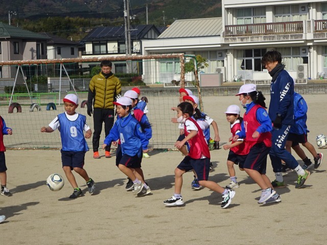 ボールを使ったゲーム形式の活動を中心にプログラムが進められました。選手によるボールさばきのデモンストレーションに、子どもたちは目を奪われ、「かっこいい!」「やってみたい!」と目を輝かせていました。サッカーをするのが初めての児童にも、選手は一人ひとりに優しく寄り添い、膝をついて丁寧に指導してくださいました。「ナイス!」と褒めてもらい、子どもたちは心から体を動かす楽しさ、仲間と協力する喜びを実感しているようでした。