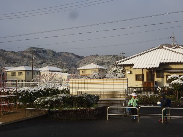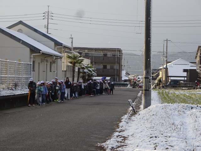 昨日からの初雪が舞い降りました。今朝は辺り一面がうっすらと雪化粧をする中、寒さに負けず、子どもたちはいつものように元気に登校しました。雪が積もった山々や屋根を眺めながら、雪の感触を楽しみ、雪を握りしめる姿も見られました。道路は少し滑りやすくなっていた箇所もありましたが、交通ルールを守り、班の友達と声を掛け合いながら、安全に学校までの道を歩きました。