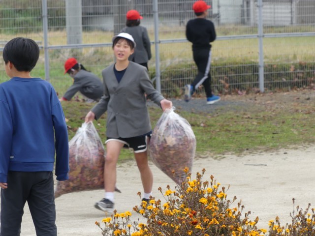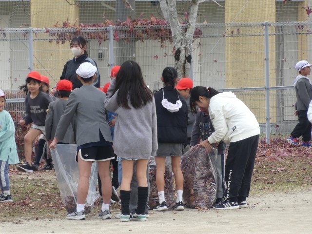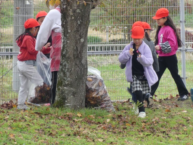 友達と声をかけ合いながら、たくさんの落ち葉をかき集め、袋いっぱいに詰めていく姿はさすが6年生です。1年生、4年生たちも笑顔で活動: 作業の中にも楽しさを見つけ、元気いっぱいに活動する姿も見られました