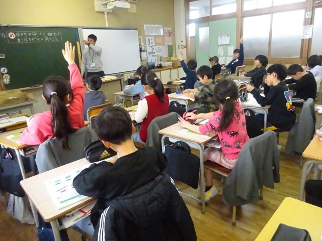 授業では多くの子どもたちが積極的に手を挙げて発言する姿が見られました。