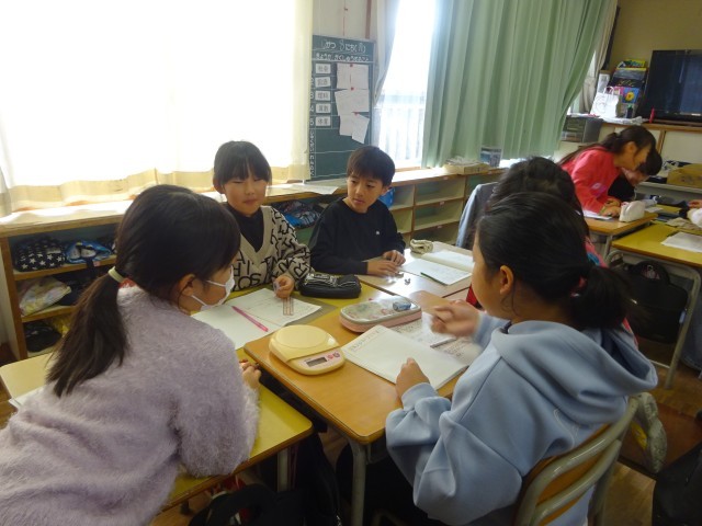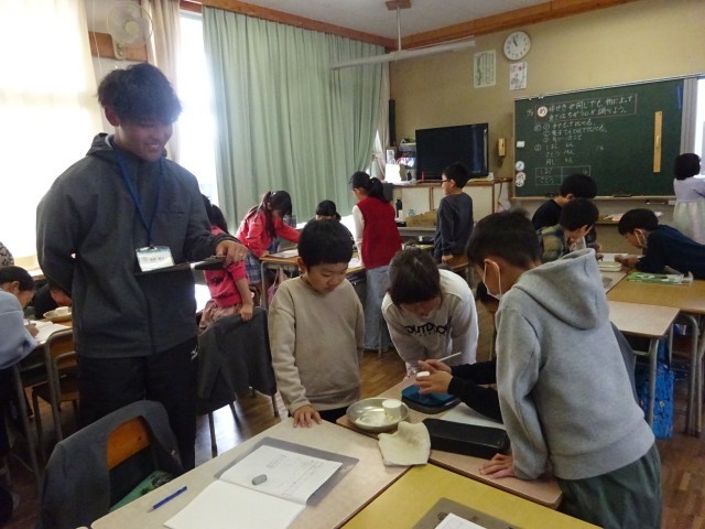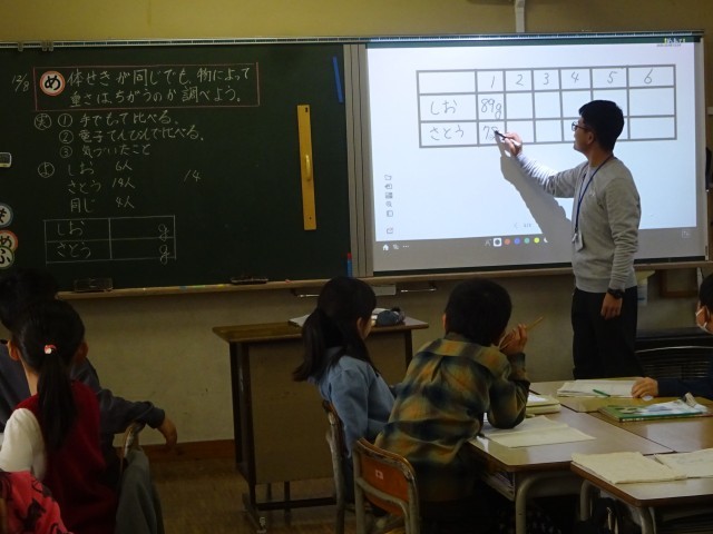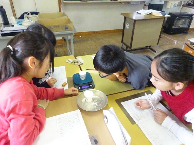 また、グループでの実験や個人での記録の際には、お互いに教え合ったり、真剣な表情でてんびんの目盛りを読み取ったりと、協力し合いながら熱心に取り組んでいました。先生が個別に机を回って実験をサポートする場面もあり、子どもたちの理解を深める助けとなりました。