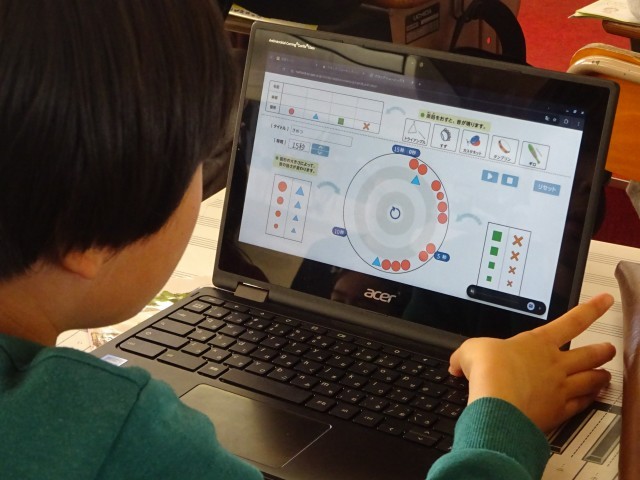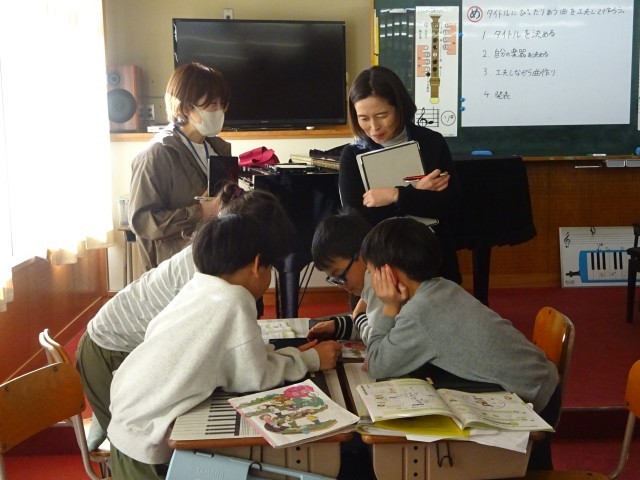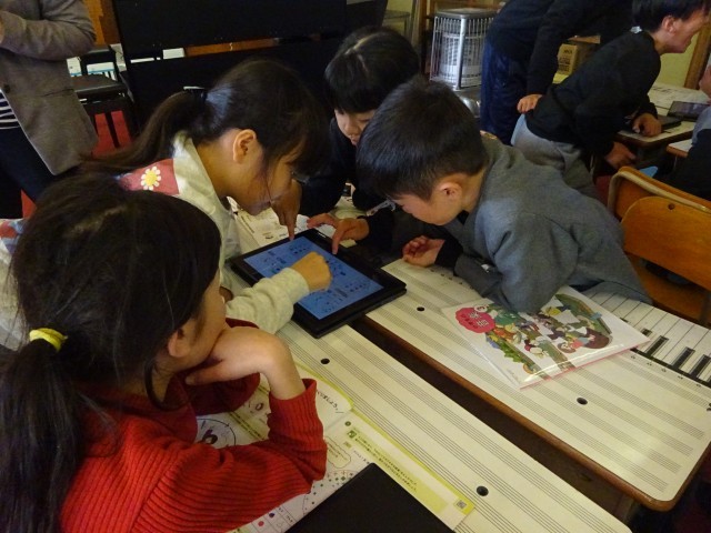 子どもたちは、曲の表情(強弱・変化)や構造(繰り返し・呼びかけとこたえ)の要素を示した資料を参考にしながら、曲のイメージを具体化していきました。授業の最大の特徴は、タブレットをを積極的に活用した作曲活動です。子どもたちはグループになり、タブレットの画面を熱心にのぞき込み、考えを交流しながら共同で作業を進めていきました。友だちと活発に意見を交換し、お互いのアイデアを取り入れながら、工夫を凝らした楽曲の制作に夢中になっていました。