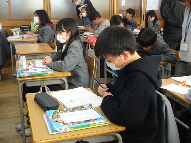 教室では、子どもたちが集中し、主体的に学ぶ姿が見られました。児童たちは、机上の教材やノートにしっかり向き合い、真剣な表情をうかがわせながら、鉛筆を走らせて自分の考えを整理していました。開かれたノートには、集中して書き込んでいる様子が見て取れました。ペアや自由な友達との意見の話し合いの場面では、子どもたちは身を寄せ合い、活発に意見を交換していました。友だちの意見に耳を傾け、うなずいたり、考えを巡らせたりする表情が印象的でした。今回の授業を通して、子どもたちは、ニュースは客観的な事実だけでなく、意図や工夫によって編集され、伝えられていることを学びました。一宮小が目指す授業に迫ってきていることを実感しました。