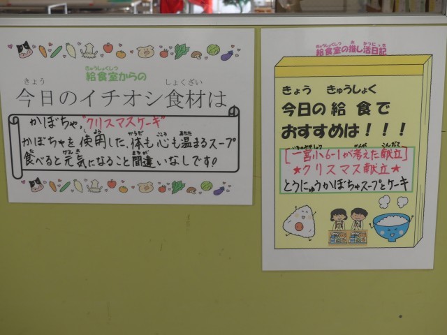12月11日の給食は、一宮小学校6年1組が考えてくれたオリジナル献立でした!献立のタイトルは「この冬にぴったり!!元気いっぱいいろとりどり献立」です。