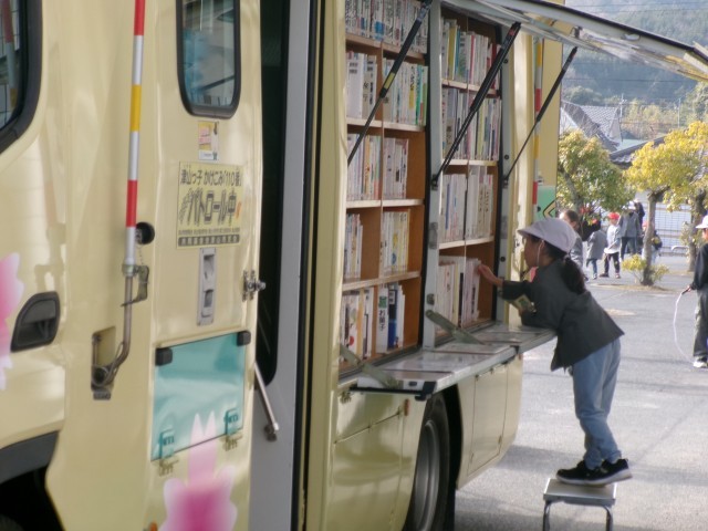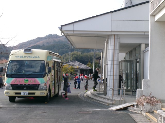 12月16日(火)、津山市立図書館の自動車文庫「ぶっくまる」が本校にやってきました!「ぶっくまる」は、図書館から遠い地域にも本を届け、子どもたちに読書の機会を提供してくれる、移動する図書館です。