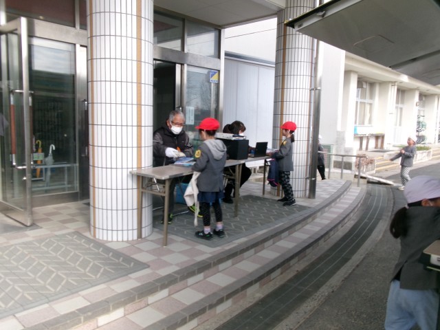 児童たちは「ぶっくまる」の周りに集まり、どの本を借りようかと真剣な表情で選んでいました。本を選び終わると、次は借りる手続きです。校舎の玄関先などに設けられた臨時の貸し出しカウンターで、図書館職員の方に本を渡します。