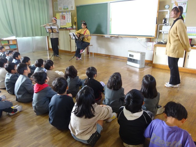 濃霧の寒い朝、校門で元気な声を響かせた「あいさつ運動」に続き、校舎内では1年生の子どもたちの心にポッと灯をともすような、温かい時間が流れました。本日、1年生の教室にて、担任団による「クリスマスミニコンサート」が開催されました。今回のコンサートは1年生の担任団が「子どもたちに、笑顔と音楽のプレゼントを届けたい」「2学期の思い出にしてほしい」という強い思いで企画したものです。