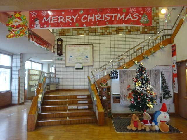 色鮮やかな「MERRY CHRISTMAS」のバナーや、きれいに装飾されたツリー、そしてサンタの帽子をかぶったキャラクターたちが、登校してきた児童たちを笑顔で出迎えてくれました。「わあ、すごい!」「かわいい!」と足を止める児童も多く、学期末の忙しい時期に、ホッと心を和ませてくれる素敵な空間となっています。いよいよ明日から冬休みです。