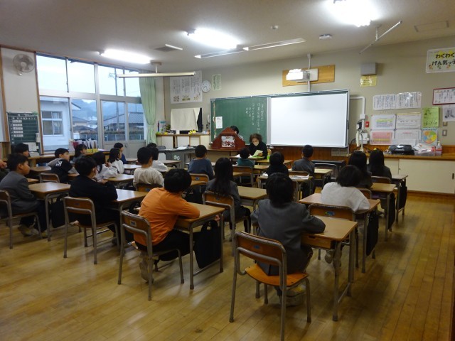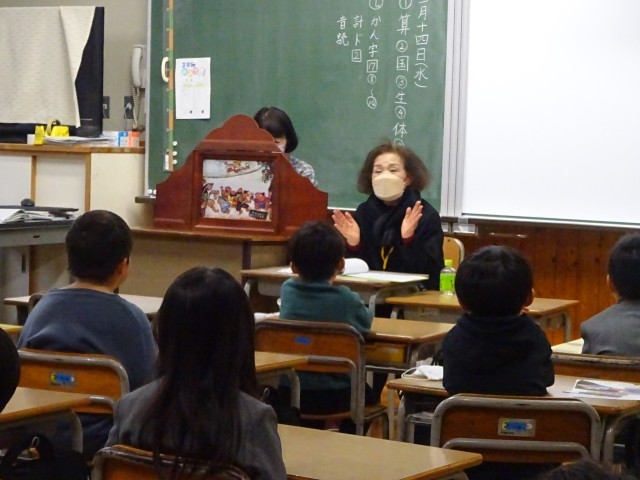 また、趣のある木枠の舞台を使った紙芝居が披露されました。語り手の情感あふれる声に、子どもたちは身を乗り出すようにして見入っていました。冬休み明けの初回の読み聞かせでしたが、子どもたちは驚くほど集中して静かにお話を聞いていました。