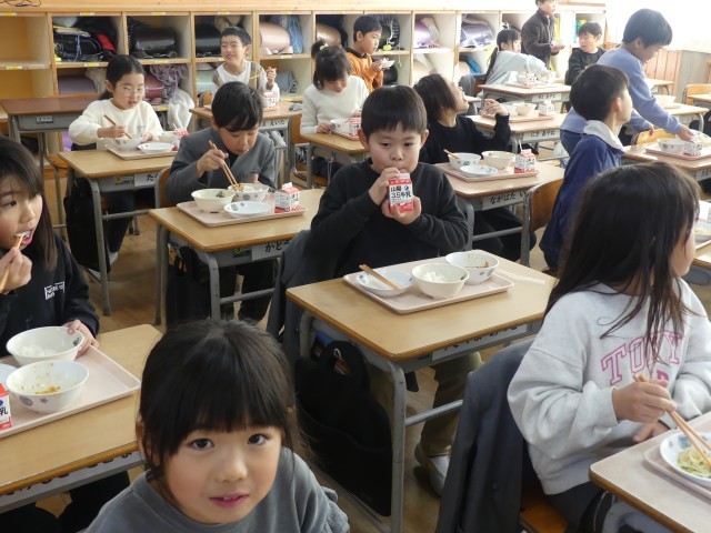 「マーボーどうふにはたくさんの野菜が入っていて冷めにくいので、体も温まります」という、メッセージも添えられていました。2年生の教室をのぞいてみると、みんな夢中で頬張っていました。