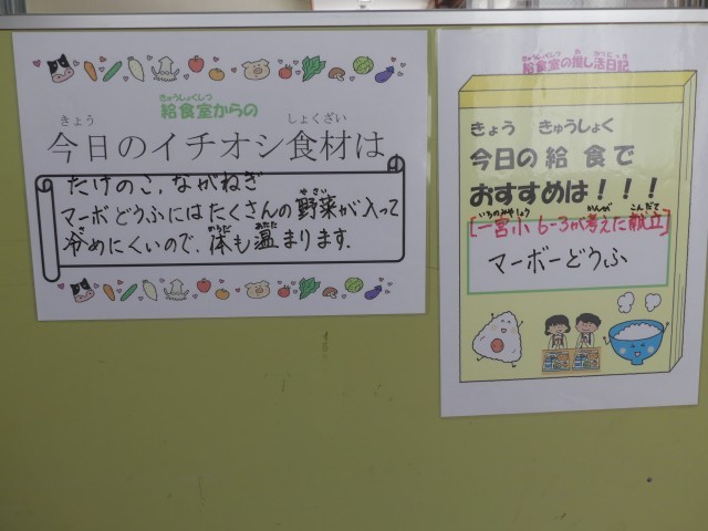 なんと、一宮小学校6年3組の児童が家庭科の授業で一生懸命考えた献立が登場したのです!今日のメニューは、ご飯、麻婆豆腐、バンサンスー、牛乳でした。