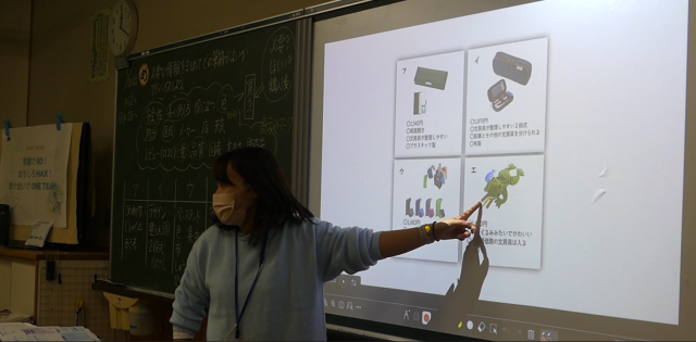 チャイムが鳴ると、電子黒板には4つの個性豊かな筆箱が映し出されました。今回のミッションは、架空のキャラクター「たいせい君」へのアドバイスです。「予算は2,000円以内」「緑色が好き」「長く使いたい」といったたいせい君のこだわり条件に対し、どの筆箱が最もふさわしいかを考えます。「えー、これ可愛いけど予算ギリギリだよ」「こっちは丈夫そうだけど、定規が入るかな?」教室内には、まるで本物の買い物に来たかのような、ワクワクした声が響きます。