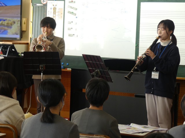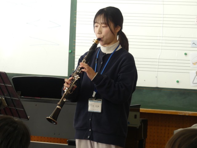 音楽室から、優しくも力強い音色が聞こえてきました。5年生の音楽の時間に、担任と音楽専科の先生によるミニコンサートが行われました。今回演奏された楽器は、温かみのある音色のクラリネットと、華やかな響きのフリューゲルホルンです。