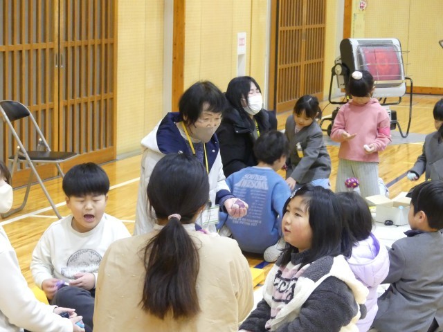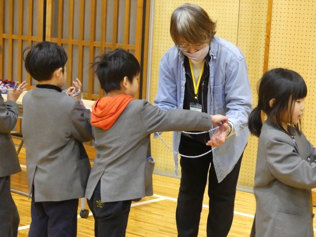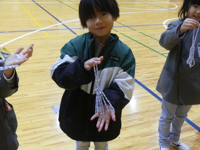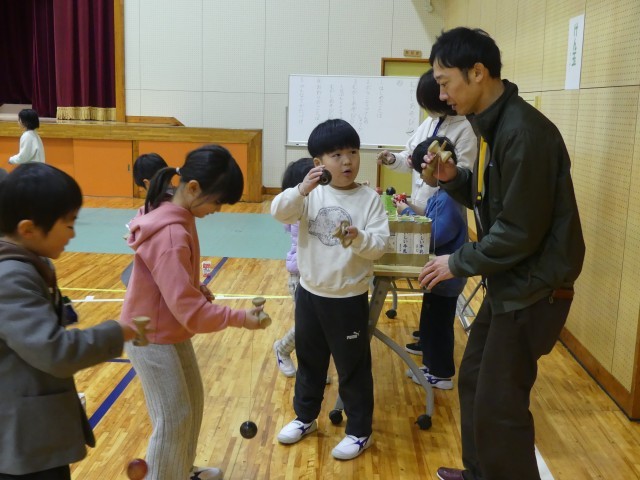 朝の体育館は冷え込んでいましたが、遊びに夢中になるうちに、子どもたちの顔は真っ赤に。名人の皆さんとお話ししたり、技を褒めてもらったりする中で、終わるころには体だけでなく、心も「ほっかほか」に温まったようです。「またやりたい!」「お家でも練習する!」と、伝統的な遊びの楽しさを存分に味わうことができました。